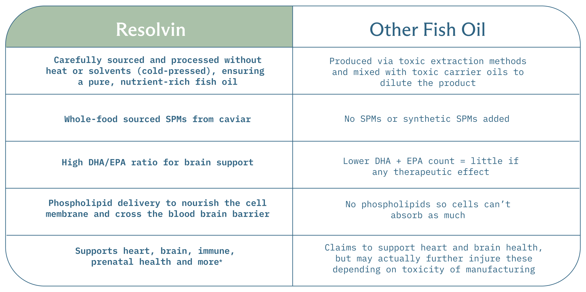 Resolvin combines a phospholipid-based 3:1 DHA/EPA essential fatty acids with caviar extract, a completely natural, whole-food source of SPMs. This unique combination provides a powerful (and highly bioavailable) restorative effect throughout the body, supporting your brain, heart, skin health, and more.*